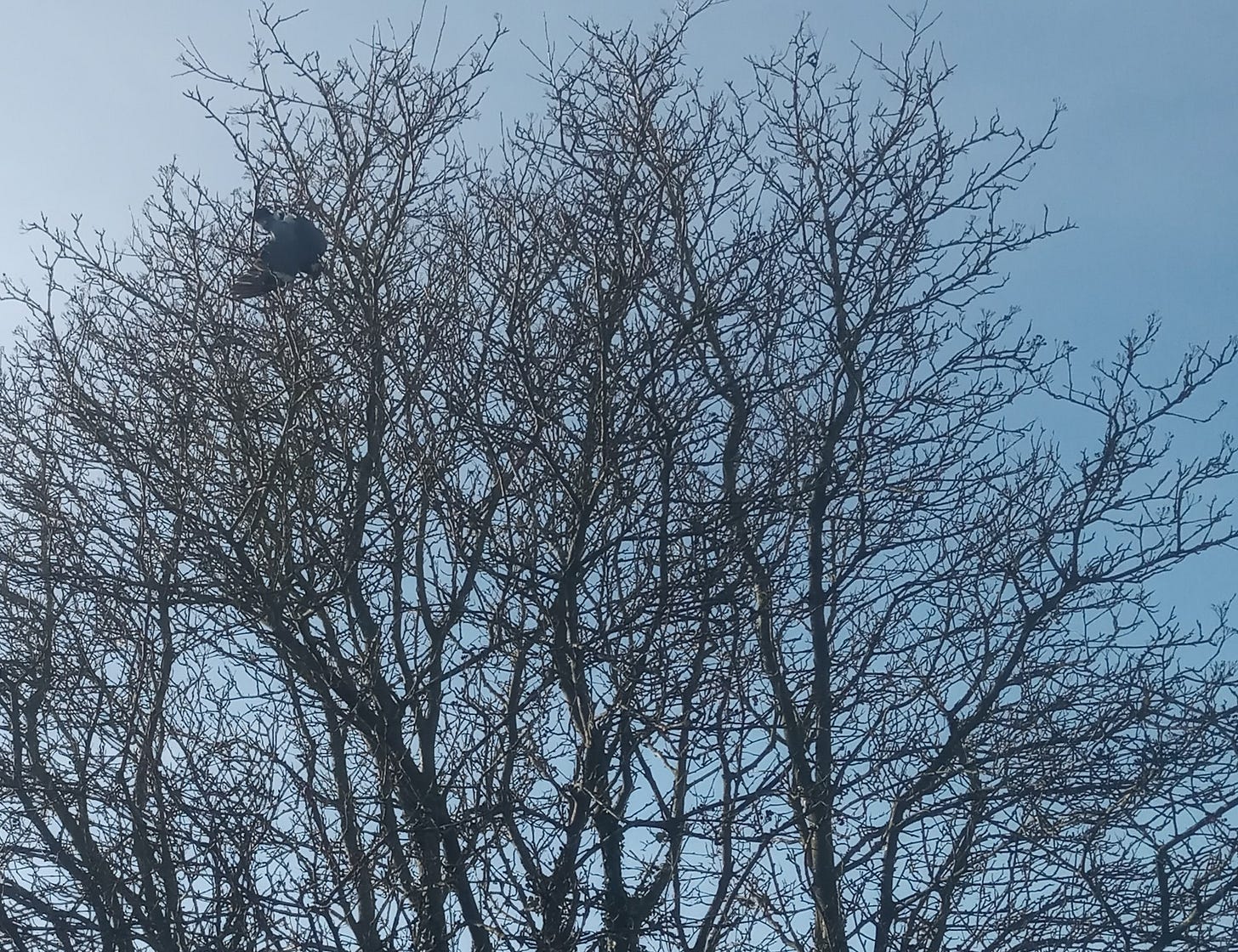 On the way to the doctor’s for a blood test, I passed a woodpigeon that appeared to be tangled in a street tree. It was still but leaning forward, its wings in a blazon as if caught mid glide. Its eye was white and wild, but they are always like that; still I was pretty sure it was stuck. I was early for my appointment but not that early. I went and came back. Then I got the loppers out of the cellar, gardening gloves, a black fleece to throw over it, scissors and my old Vietnamese army rucksack to lug all that up the tree in. It was one of those hybrid Sorbus that serve as street trees and half of its branches seemed to be dead. Not enough kids climbing trees in this village. I had to lean rather precariously to hook the loppers round the right branch and I squeezed and sawed and cursed until I’d severed it. Then I dragged it in through the other twigs and brought the bird close. It was flapping madly all the time, of course, and I roughly managed to pin its wings back with one hand. I’d seen one wing was bloodied in the struggle but, as I drew it in, it became clear that the tangled leg was lost to use. What I should have done then, in retrospect, was lop that leg straight off at the ankle. Instead I snipped away as much as I could of the fishing line that bound it to the twig. Then I snipped away the twig itself each side and then, of course, I dropped the pigeon.